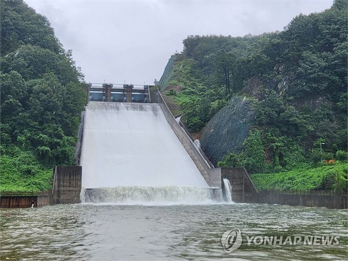 방류하는 완주 대아저수지 전북 지역에 거센 장맛비가 쏟아진 14일 완주군 대아저수지에서 물을 방류하고 있다. 2023.7.14 [완주군 제공. 재판매 및 DB 금지]
