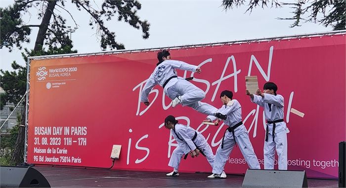 동아대 태권도 시범단의 공연 (파리=연합뉴스) 송진원 특파원 = 31일(현지시간) 프랑스 파리에서 열린 '부산데이 인(IN) 파리' 행사에서 동아대 태권도 시범단이 공연을 펼치고 있다. 2023. 8. 31 san@yna.co.kr