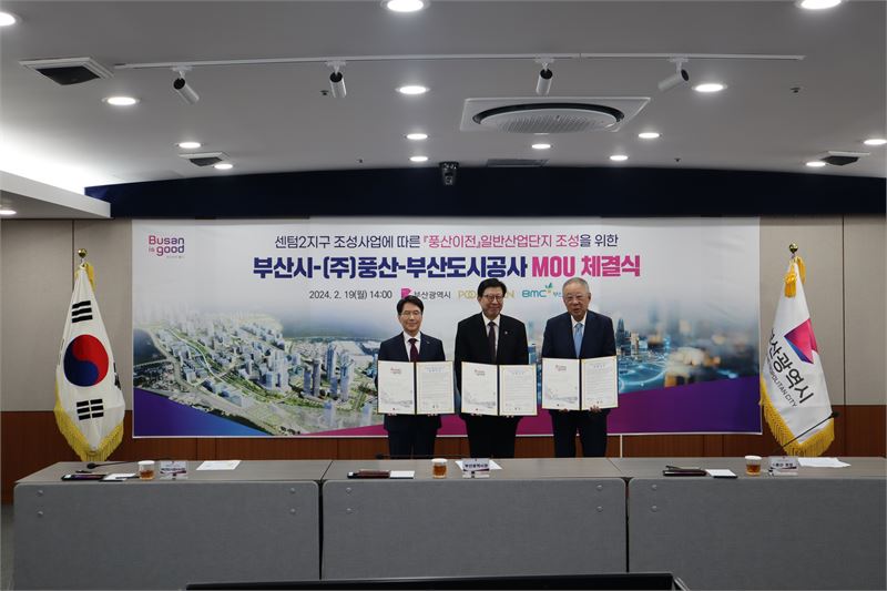 부산도시공사(사장 김용학)는 19일 ㈜풍산 부산공장의 조속한 이전을 위해 부산시, 풍산과 MOU(양해각서)를 체결하고, 각 기관 간의 협력 강화를 약속했다고 밝혔다.