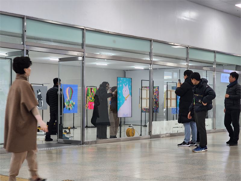 터미널을 찾은 이용객들이 작품을 감상 하고 있다. /사진=부산시설공단