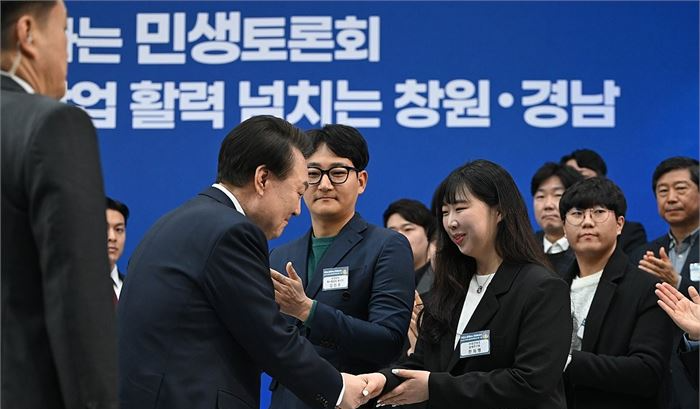 윤석열 대통령, 원전산업 민생토론회 참석 윤석열 대통령이 지난 22일 경남도청에서 '다시 뛰는 원전산업 활력 넘치는 창원·경남'을 주제로 열린 열네 번째 '국민과 함께하는 민생토론회'에 입장하며 참석자와 악수하고 있다. /사진=경상남도
