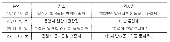 양산시, 통영시, 고성군, 창원시가 반려동물 축제를 각각 개최한다.