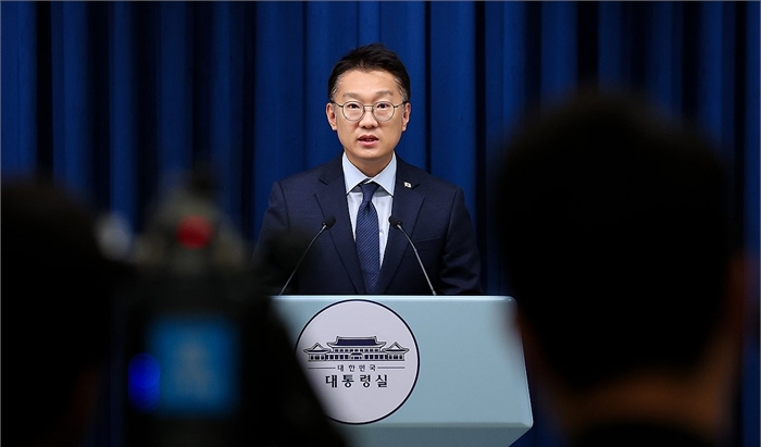 브리핑하는 김남준 대변인 김남준 대변인이 20일 용산 대통령실에서 이날 진행된 이재명 대통령의 서울 ADEX 2025 개막식 및 방위산업 발전 토론회 참석 일정 관련 브리핑을 하고 있다./ 사진=대통령실통실사진기자단