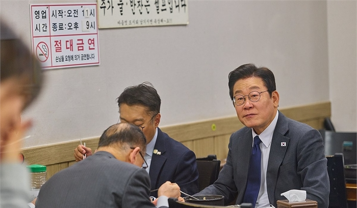 이재명 대통령, 일산시장 방문 이재명 대통령이 20일 경기도 일산시장 한 식당에서 수행원들과 점심식사를 하고 있다./ 사진=대통령실