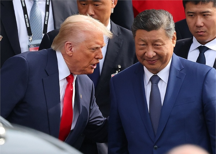 인사 나누는 트럼프·시진핑 도널드 트럼프 미국 대통령과 시진핑 중국 국가주석이 30일 부산 김해공군기지 의전실 나래마루에서 미중 정상회담을 마친 뒤 회담장을 나서며 인사하고 있다./ 사진=나래마루