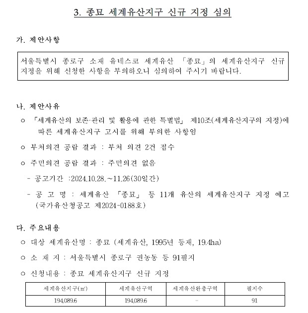 위원회는 이날 종묘를 중심으로 총 91필지, 세부적으로는 19만4천89.6㎡ 규모를 세계유산지구로 새로 지정할 방침이다.