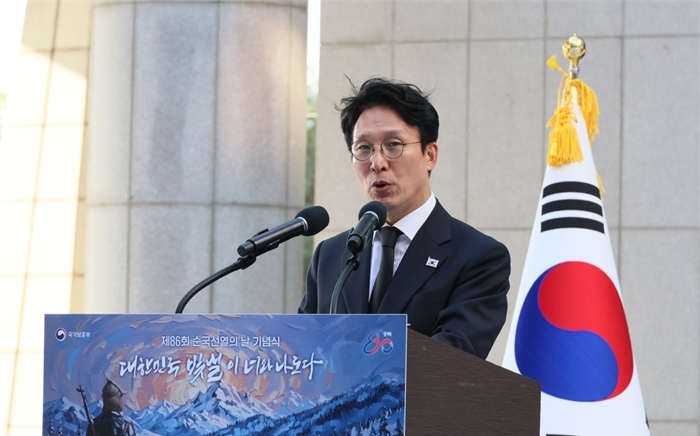 기념사 하는 김민석 국무총리 김민석 국무총리가 17일 서울 노원구 육군사관학교에서 열린 제86회 순국선열의 날 기념식에서 기념사를 하고 있다./ 사진=순국선열의 날