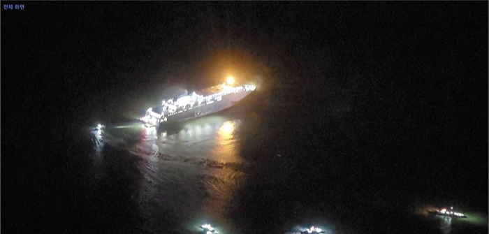 밤바다 한가운데 좌초된 대형 여객선 19일 오후 8시 17분께 전남 신안군 장산도 남방 족도에 여객선 퀸제누비아2호가 좌초돼 해경이 구조 작업을 벌이고 있다. 2025.11.19./ 사진=목포해경