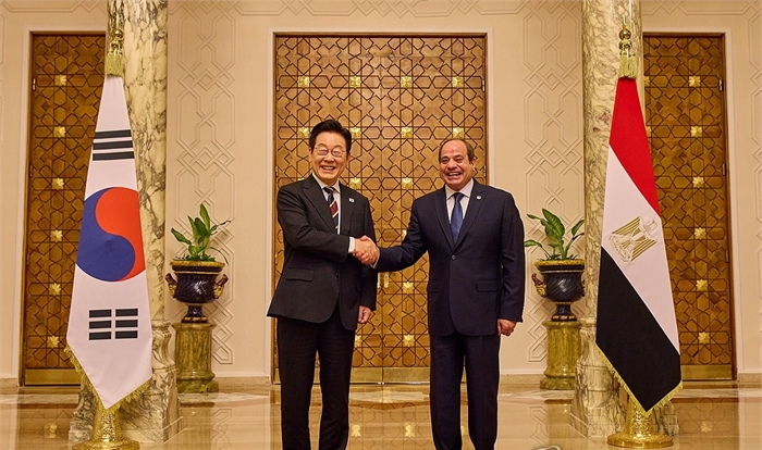 기념촬영하는 한-이집트 정상 이재명 대통령과 압델 파타 알시시 이집트 대통령이 20일(현지시간) 이집트 카이로 대통령궁에서 열린 한-이집트 단독 정상회담에 앞서 기념촬영을 하고 있다./ 사진=공동취재