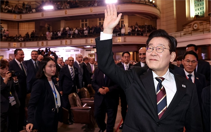 카이로대 학생들에게 인사하는 이재명 대통령 이집트를 공식 방문 중인 이재명 대통령이 20일(현지시간) 카이로대학에서 '함께 여는 빛나는 미래'를 주제로 연설을 마친 후 참석 학생들을 향해 인사하고 있다./ 사진=카이로대학