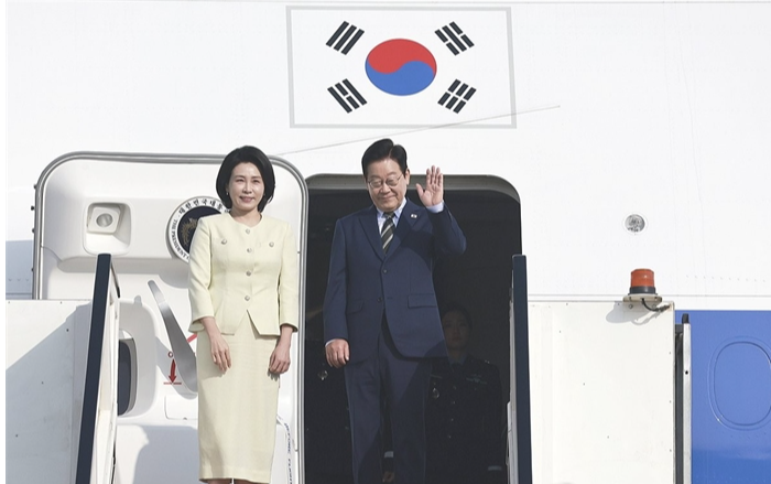 이재명 대통령 부부, 이집트 공식방문 마치고 남아공으로 이집트 공식 방문을 마친 이재명 대통령과 김혜경 여사가 21일(현지시간) 남아공 주요 20개국(G20) 정상회의 참석을 위해 카이로 국제공항에서 공군 1호기에 올라 인사하고 있다./ 사진=카이로국제공항