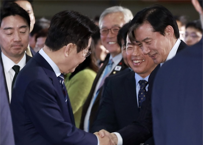 인사하는 이재명 대통령과 조국 대표 이재명 대통령이 2일 경기 고양시 킨텍스에서 열린 제22기 민주평화통일자문회의 출범회의에서 조국 조국혁신당 대표와 악수하고 있다./ 사진= 대통령실통신사진기자단