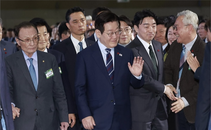 이재명 대통령, 제22기 민주평통 출범회의 참석 이재명 대통령이 2일 경기 고양시 킨텍스에서 열린 제22기 민주평화통일자문회의 출범회의에 이해찬 수석부의장(왼쪽)과 입장하고 있다./ 사진=대통령실통신사진기자단