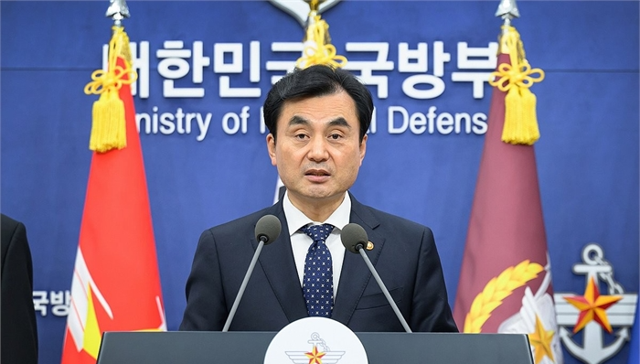 안규백 국방부 장관 안규백 국방부 장관이 14일 오후 서울 용산구 국방부 브리핑룸에서 제57차 SCM 성과에 대해 발표하고 있다. / 사진=국방부