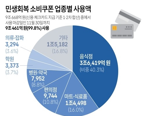 업종별 사용처를 보면 신용·체크카드로 지급된 소비쿠폰은 대중음식점에서 가장 많은 40.3%(3조6천419억원)가 사용됐다.