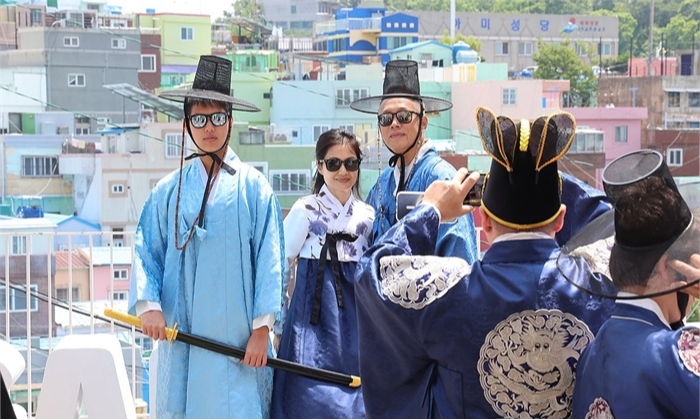 사진=부산 감천마을, 한복 입은 외국인 관광객 기념 촬영