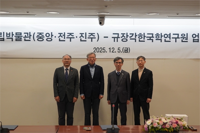 국립중앙박물관, 서울대 규장각한국학연구원과 협약 왼쪽부터 장용준 국립진주박물관장, 유홍준 국립중앙박물관장, 정긍식 규장각한국학연구원장, 박경도 국립전주박물관장./ 사진=국립중앙박물관