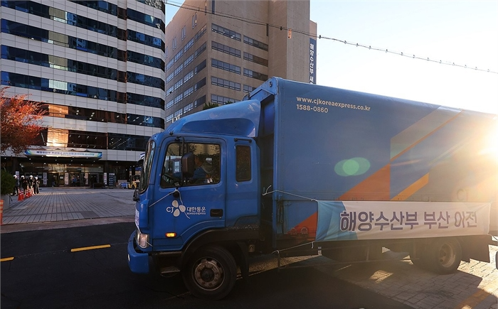 해수부 부산에 첫발 9일 오전 부산 동구 해양수산부 부산청사에 이사차량이 도착하고 있다. 해양수산부가 세종에서 부산으로 이전을 시작했다. 오는 10일부터 해운물류국을 시작으로 부산 청사에서 단계적으로 업무를 개시하며 21일까지 이사를 모두 완료할 예정이다. 2025.12.9