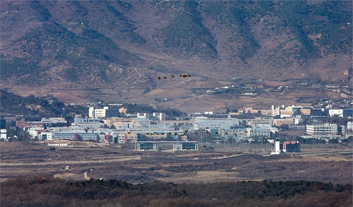 '비무장지대를 가르며' 정부가 남북 군사당국회담을 북한에 공식 제안한 가운데 18일 경기도 파주시 접경지에서 바라본 서부전선 비무장지대(DMZ)와 개성공단 일대에서 철새들이 남북을 가르며 날아 가고 있다.