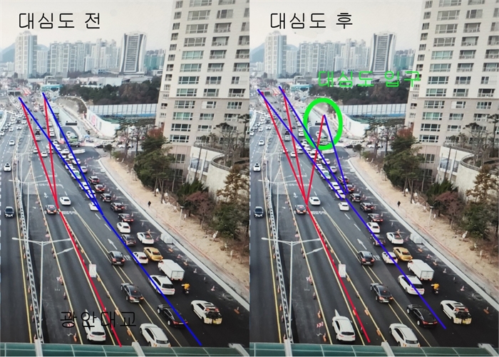 시는 대심도 출입구 쪽 도로 한복판에 긴 화단을 조성해 대심도에서 나온 차량은 화단 끝에서 광안대교 방면으로 합류하도록 하고, 수영강변대로나 과정교에서 오는 차량은 화단이 시작되기 전 지점에서 대심도 방면으로 합류하도록 동선을 분리하는 대책을 만들었다.