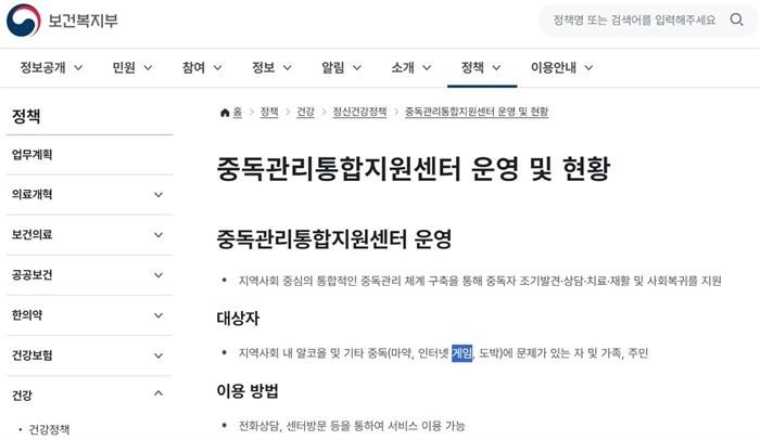 보건복지부 공식 홈페이지의 '중독관리통합지원센터 운영' 항목./ 사진=한국게임이용자협회